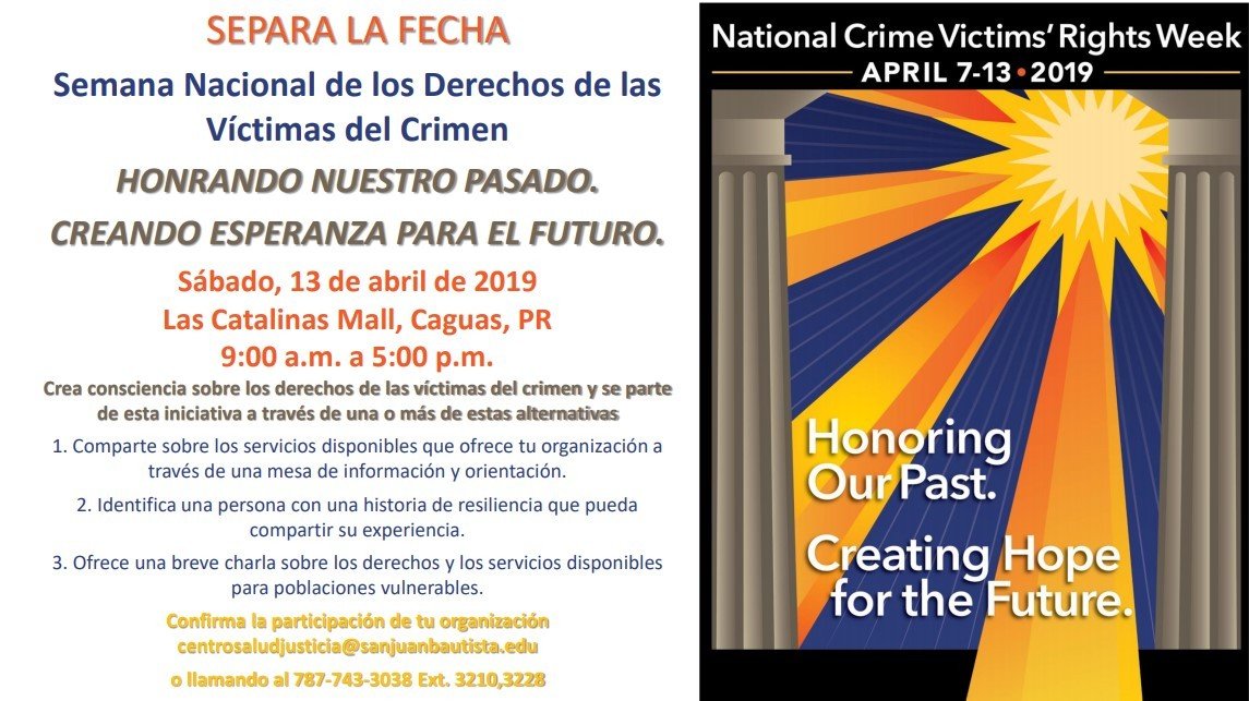 The National Crime Victims’ Rights Week is celebrated every year in April and isdedicated to education about victimization; the effect victimization has onindividuals, families, friends and the community; and to the promotion of laws,bpolicies, and programs to help victims of crime. During this week, SJBSM staffed aninformation table in the Catalinas Mall in Caguas, where about 500 personsreceived orientation from students and faculty and printed educational materialon violence against women. Information Table Theme: Violence against Women